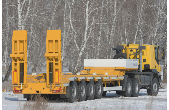 58500 кг, шины 395/85R20 или 445/65R22,5 / 8+1, платформа 9280 (10142 до трапов) x 3000 с уширителями до 3505 мм, ССУ 1550 мм, рессорная подвеска