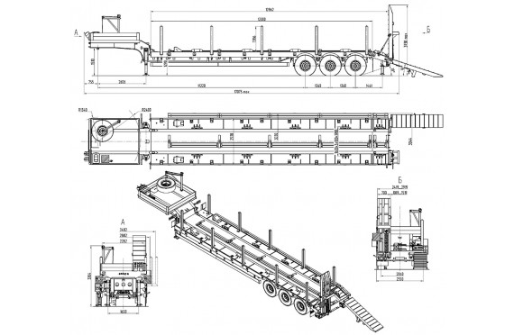 44500 кг, шины 395/85R20 или 445/65R22,5 / 6+1, платформа 12000 (12862 до трапов) x 2530 с уширителями до 3030 мм, ССУ 1510 мм, рессорная или пневматическая подвеска, раздвижные коники, механические трапы с пружиной